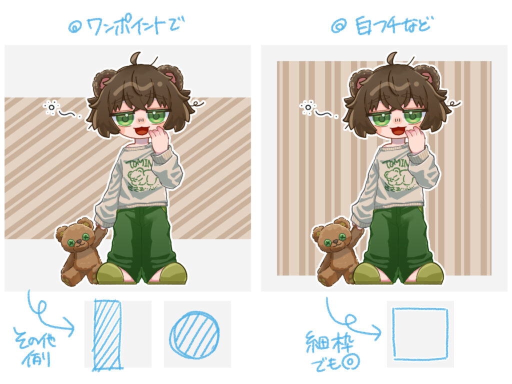 背景全体に入れても良いですし、ワンポイントとして一部に使ったり、前述の「白枠」と組み合わせるのもおすすめです。