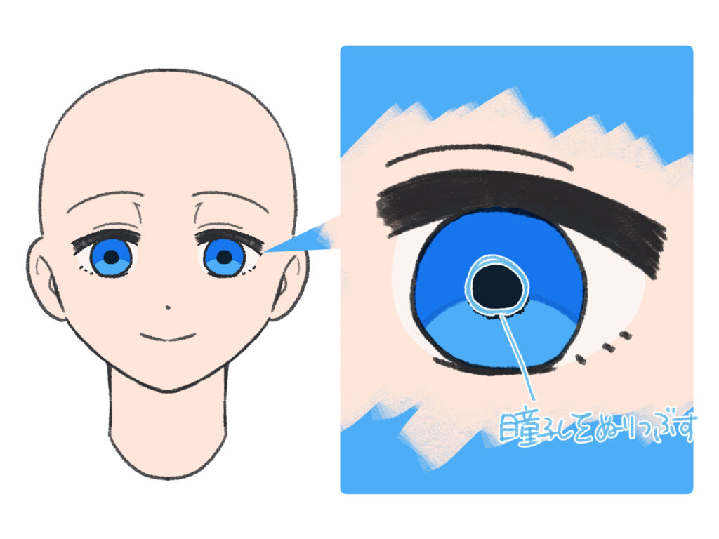 瞳の真ん中あたりに「瞳孔」を描きます。 円形を意識して配置しましょう。色は、先ほどのグラデーションで使った暗い色と同じくらいか、さらに一段階暗い色がオススメです。