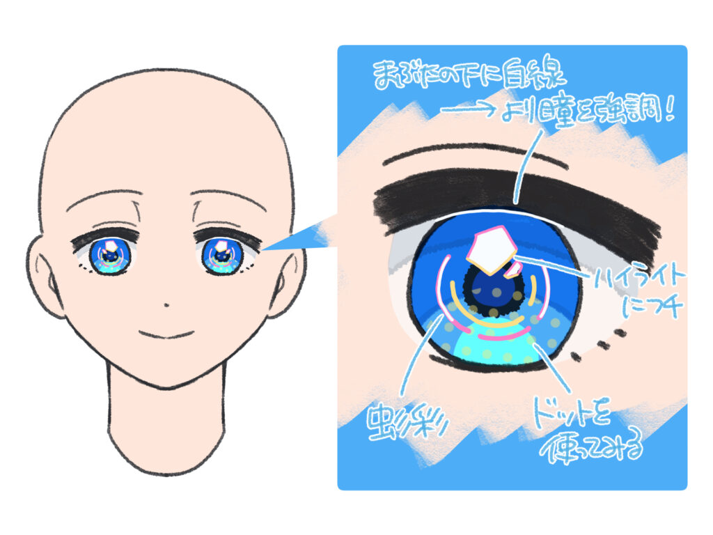 さらに描き込むと、クオリティがアップします。 瞳孔の下に虹彩(瞳の模様)を描いたり、ハイライトに少しフチを付け足したりしてみましょう。 ここまでの基本的な流れをマスターしたら、自分の好きな絵柄やイメージに合わせてアレンジを楽しんでください。