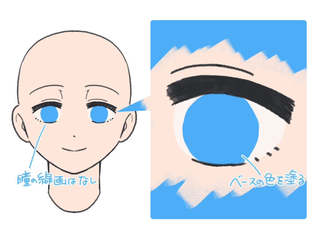 まずはベースとなる色を塗ります。好きな色を選んで構いません。 白目の部分は真っ白(#FFFFFF)ではなく、薄いグレーや肌色に近いクリーム色を選ぶと、肌と馴染みやすくなります。