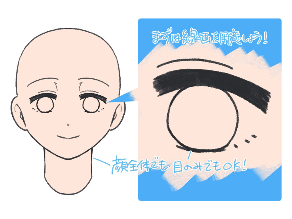 まずは線画を用意しましょう。顔全体でも、目のパーツ単体でも構いません。 肌色も下塗りしておくと、仕上がりのイメージがつきやすくなるのでオススメです。