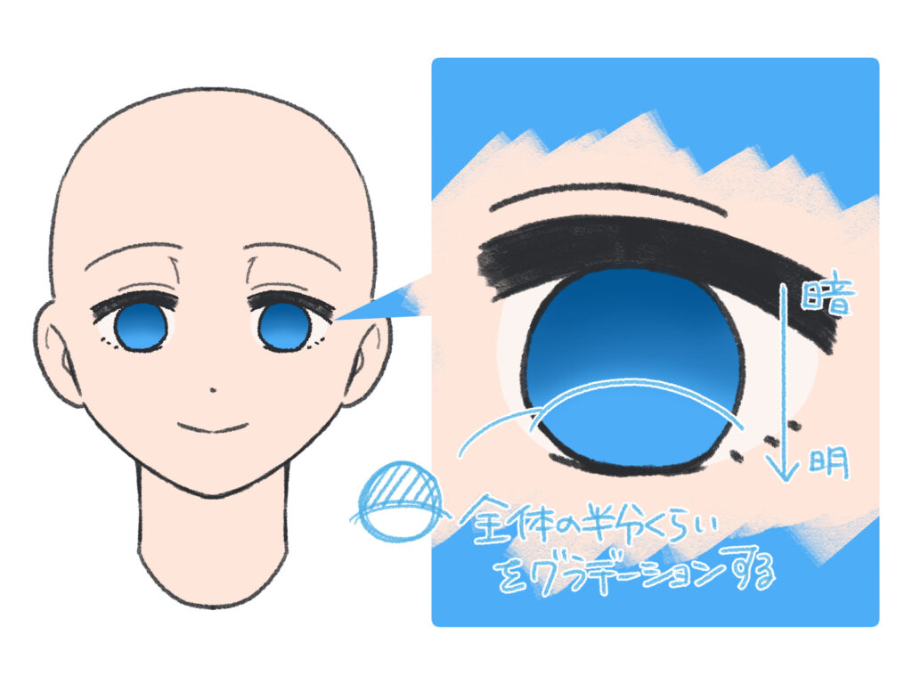 瞳にグラデーションをかけ、奥行きを出します。 瞳のベースレイヤーの上に新規レイヤーを作成し、クリッピングを設定します。こうすることで、瞳からはみ出さずに塗ることができます。