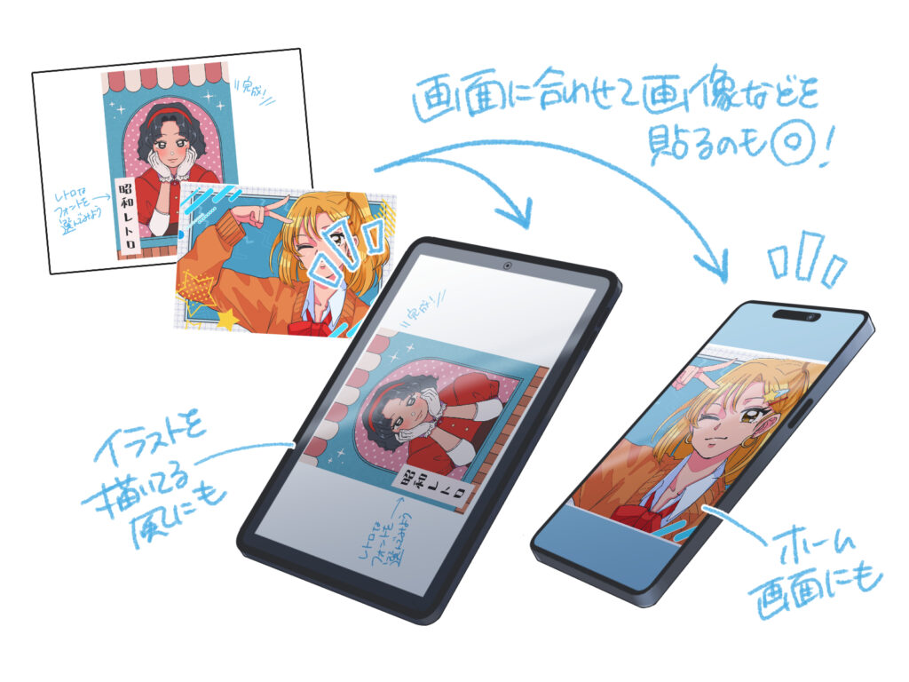 iPadやスマホの画面部分に、別途描いたイラストや写真を貼り付けると、よりリアリティのあるイラストになります。 貼り付ける際は、「自由変形ツール」を使って、画面のパース(傾き)に合わせて画像の形を変形させてフィットさせましょう。