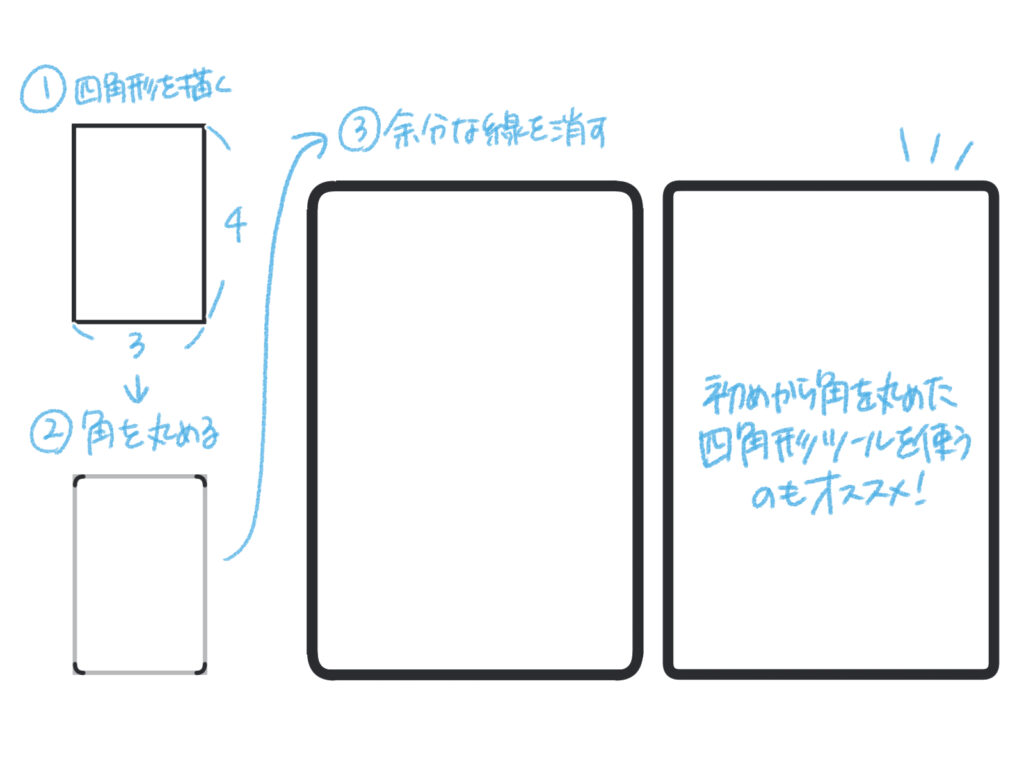 まずは基本となる正面向きのiPadを描いていきます。フリーハンドではなく、図形ツールを活用するのがコツです。