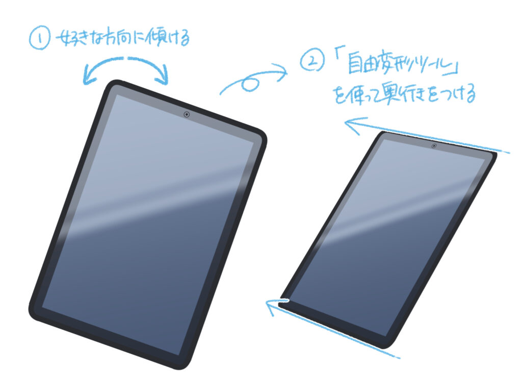 先ほど描いた正面向きのiPadを選択し、「変形ツール」で好きな方向に傾けます。