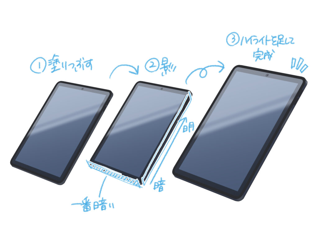 全体を塗り、側面に影を落とし、角にハイライトを足せば完成です。