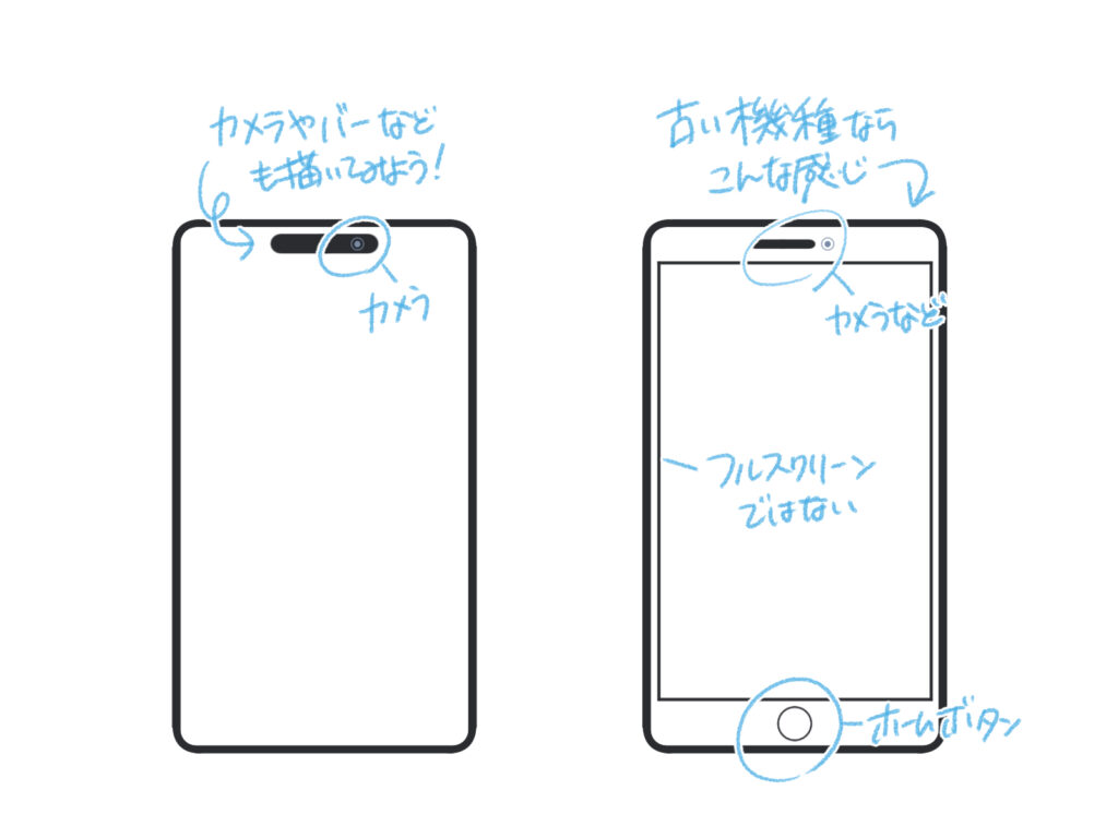 さらに、カメラレンズを描き加えるとリアリティが増します。ホームボタンがある古い機種の場合は、画面をフルスクリーンにせず、枠外にボタンを描き加えましょう。