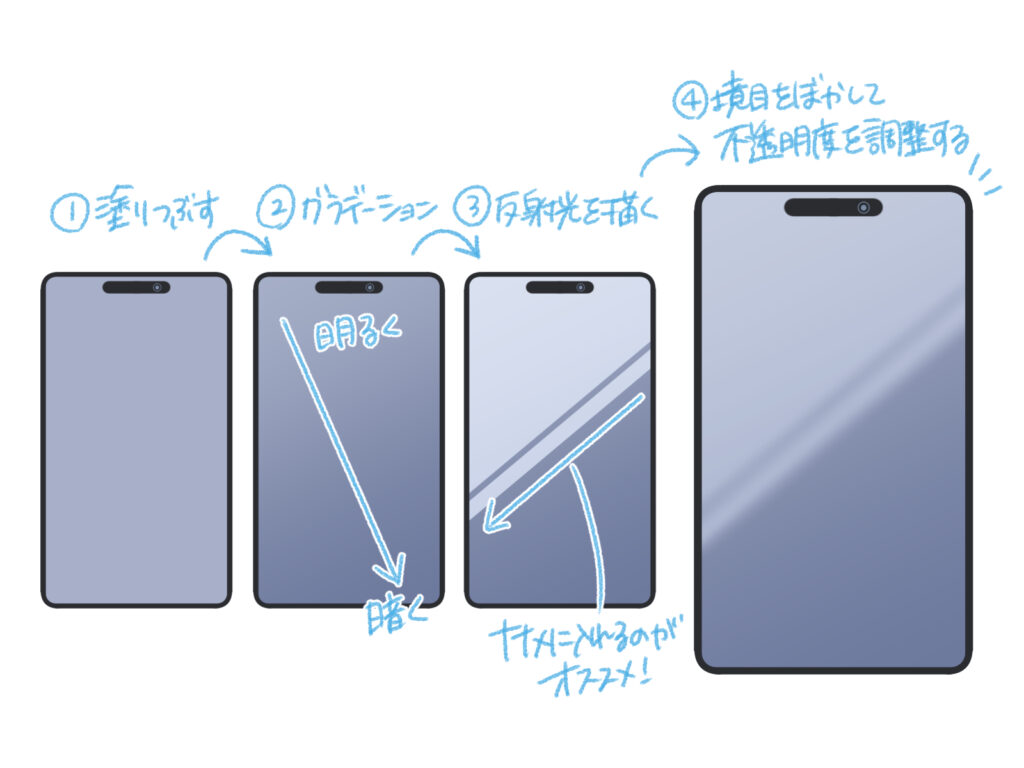 画面を塗る際は、以下の手順で「ガラス質の光沢」を表現します。
