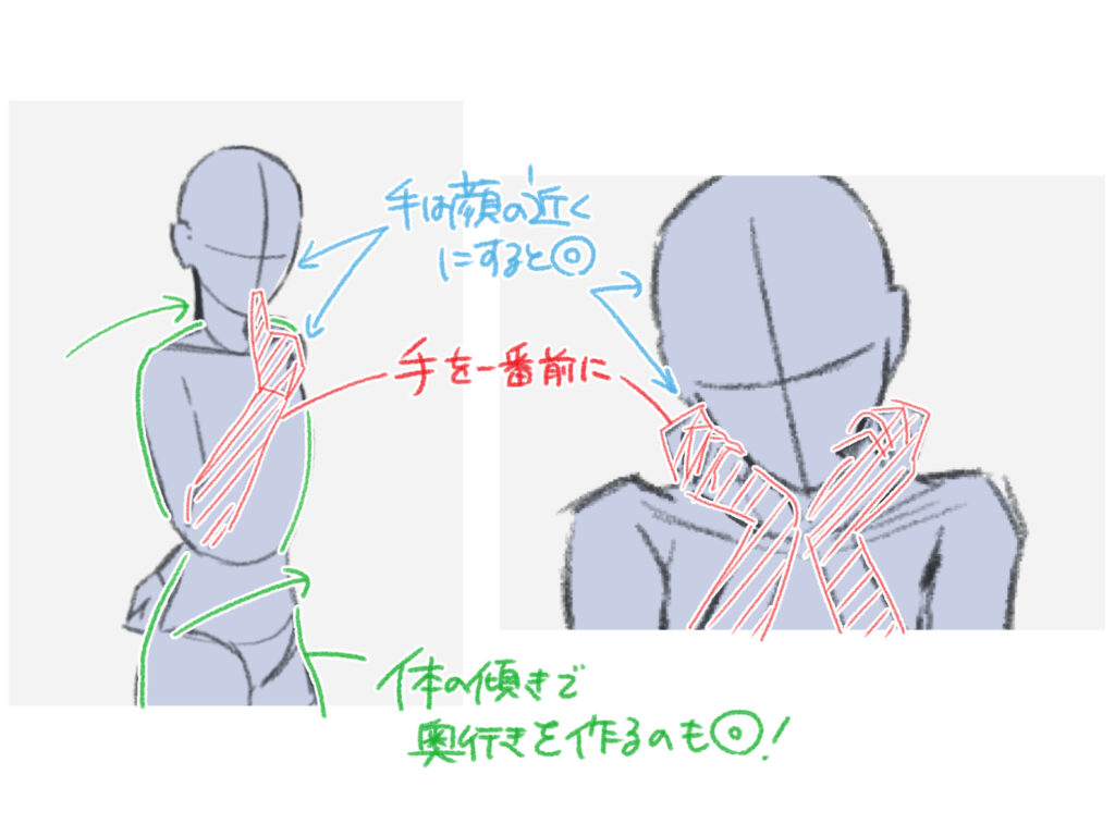 背景を描くのが苦手な人は、キャラの手や肩を手前に持ってくるだけでOKです。 例えば、手を顔の前に持ってくるだけで視線が誘導され、自然な奥行きが生まれます。