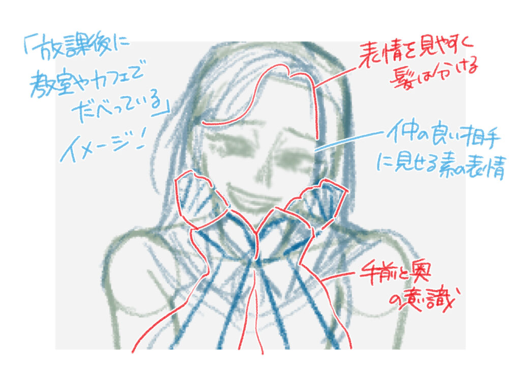 構図が決まったら、どんな場面かというストーリーを考えます。 今回は、「放課後の教室やカフェでおしゃべりしている」という設定で進めます。