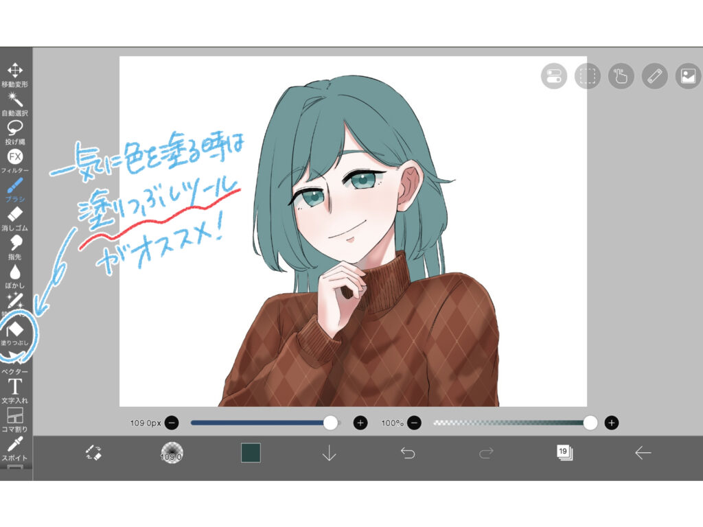 広い範囲を一気に塗るときは、塗りつぶしツールを使うのがオススメです。はみ出した部分は消しゴムツール、細かい隙間はブラシツールで丁寧に埋めましょう。