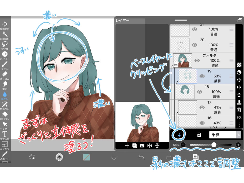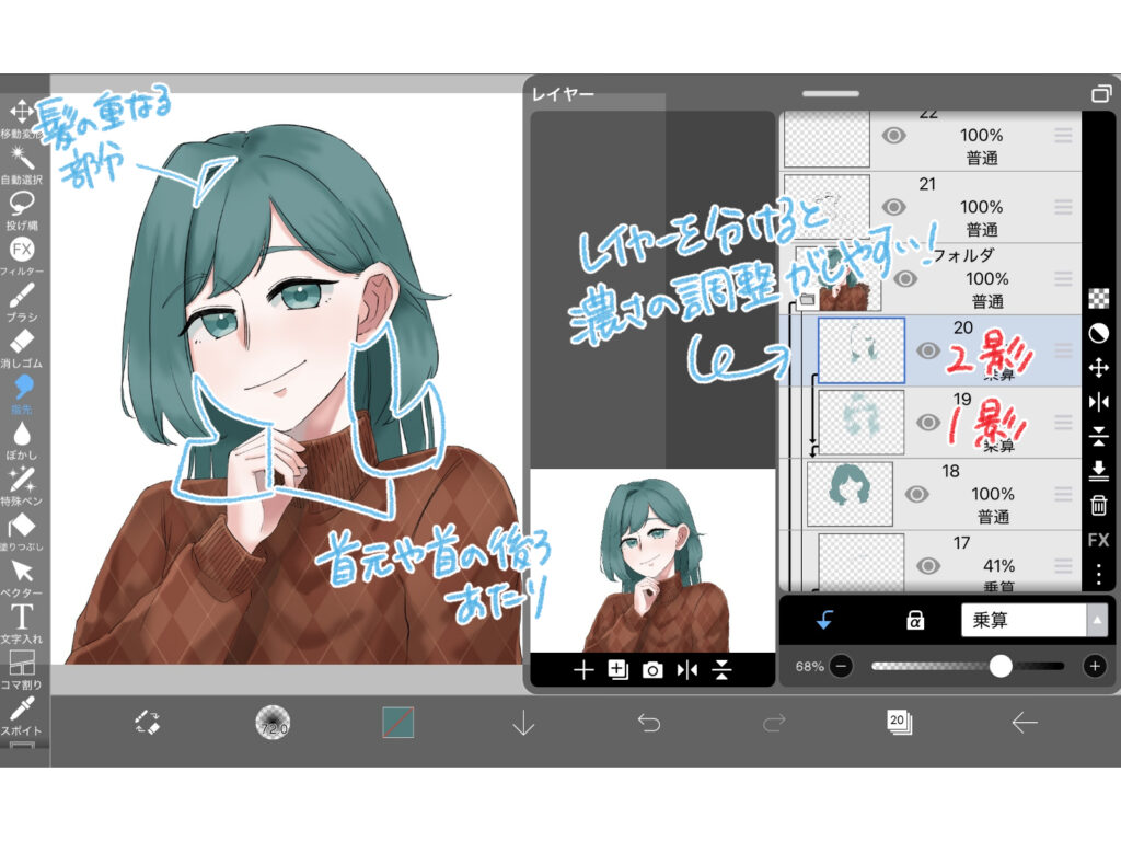 髪が重なる部分、首元、後頭部など、光が届きにくい場所を中心に塗ります。1影と同じくGペン(ソフト)で毛流れを描き、ぼかしツールで調整するのがポイントです。