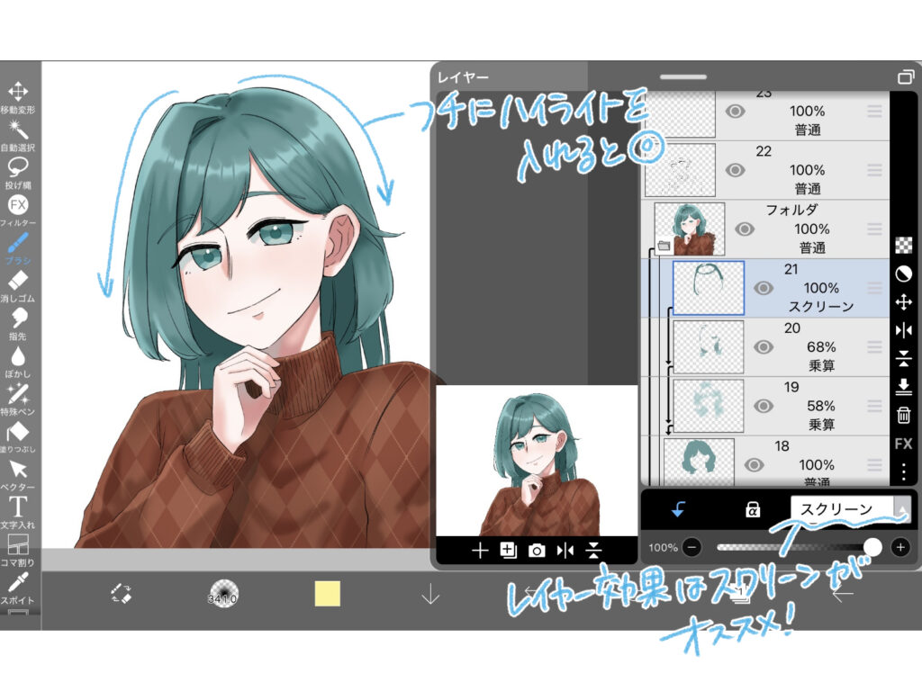 ハイライト用レイヤーのブレンドモードをスクリーンに設定しましょう。色が明るく柔らかい印象になり、自然なツヤ感が出せます。