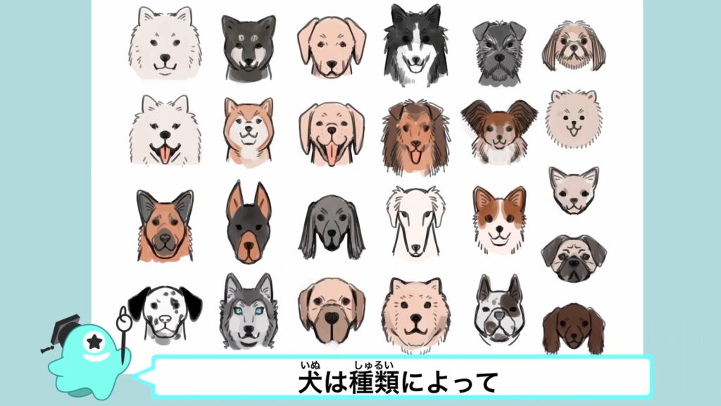犬は猫と違って、種類によっていろんな形や大きさがあるけれど、特徴をとらえると簡単にかけちゃうよ!