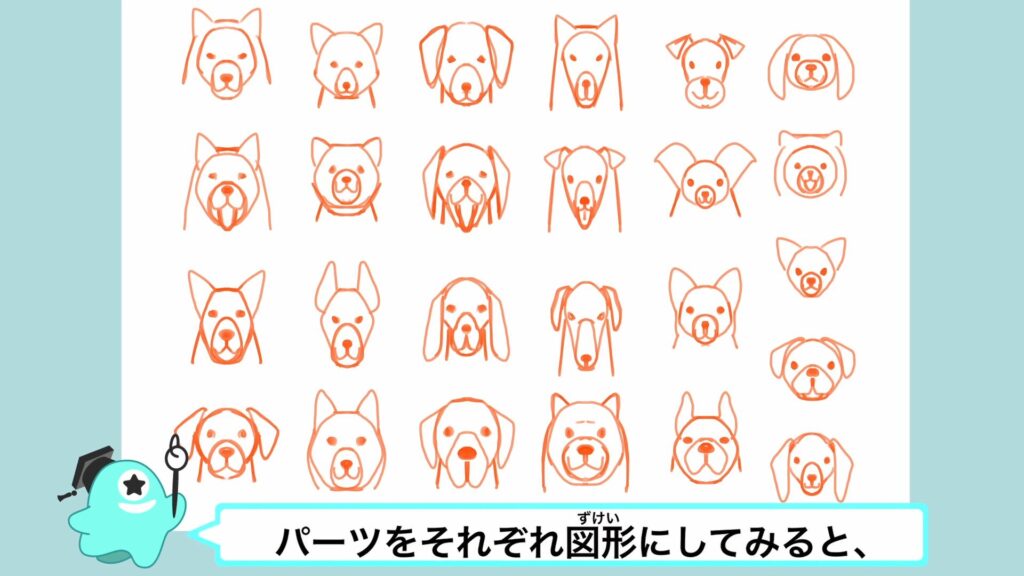 犬の顔は複雑そうにみえるけど、パーツをそれぞれ図形にしてみると、結構単純だよね!