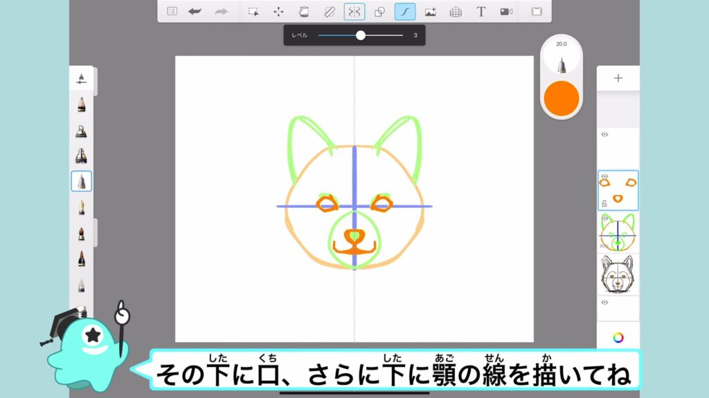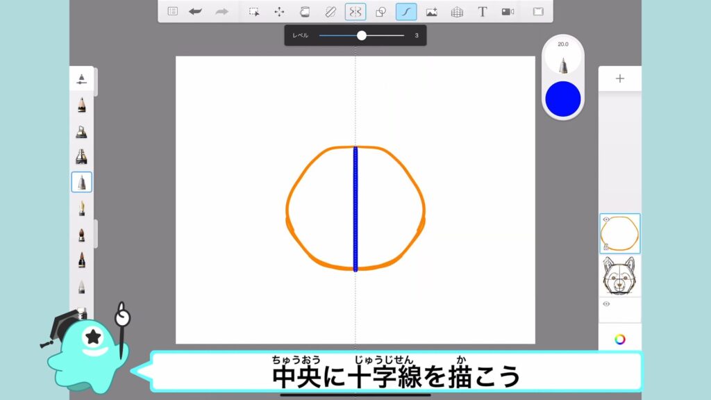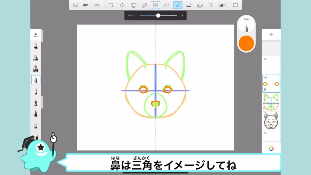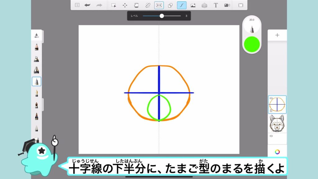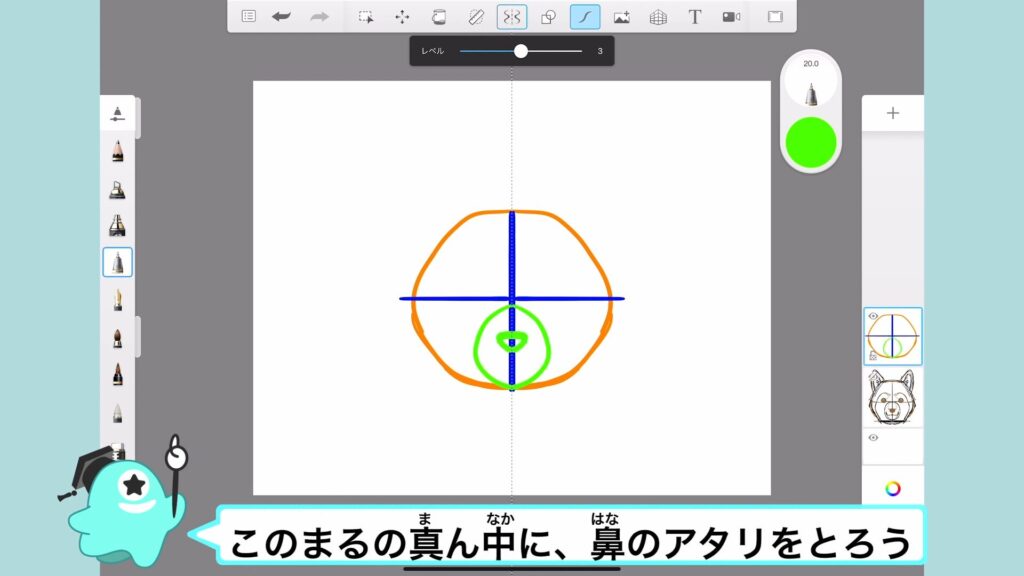 中央の十字線を描いたら、下半分に鼻を描いていくよ。