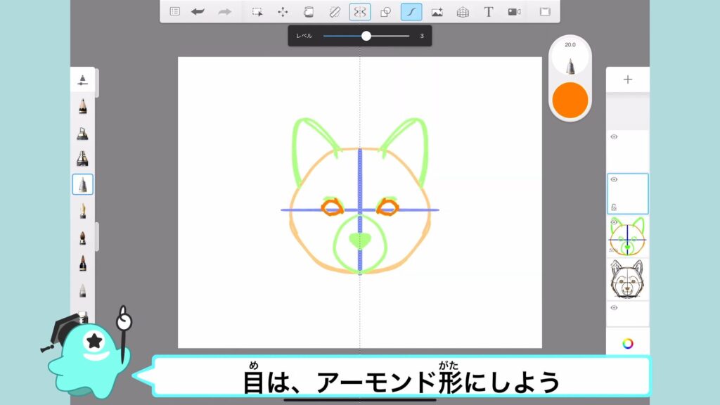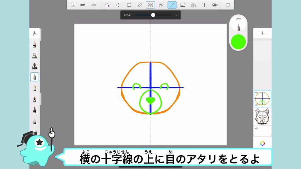 横の十字線の上には、犬の目のアタリをとるよ。