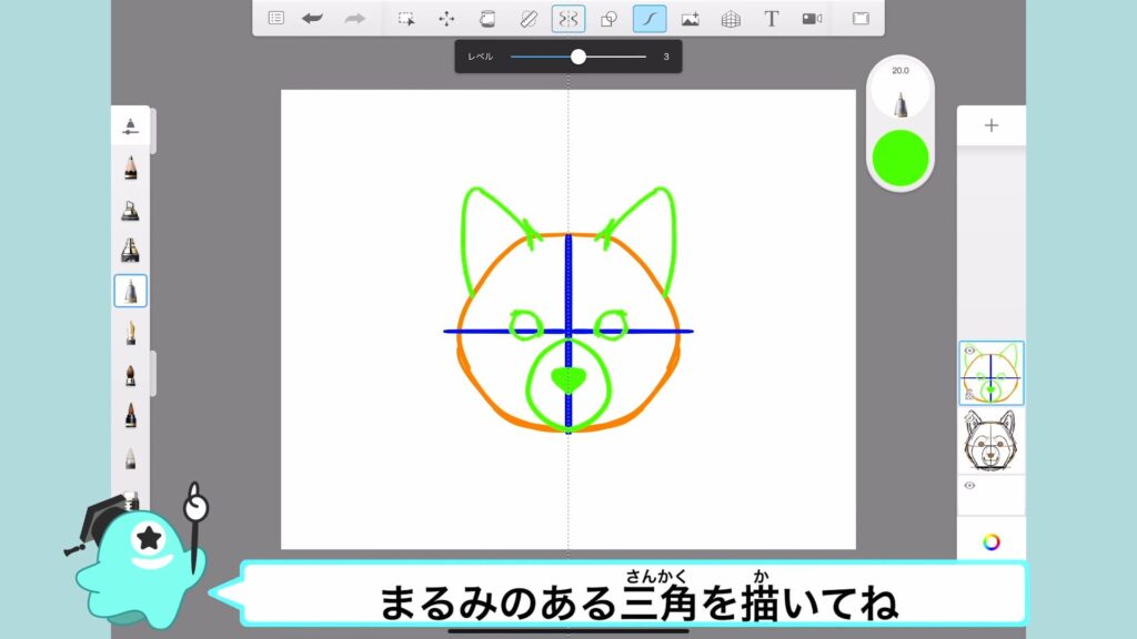 犬の耳は、うえの辺の両端からまるみのある三角を描いてね。
