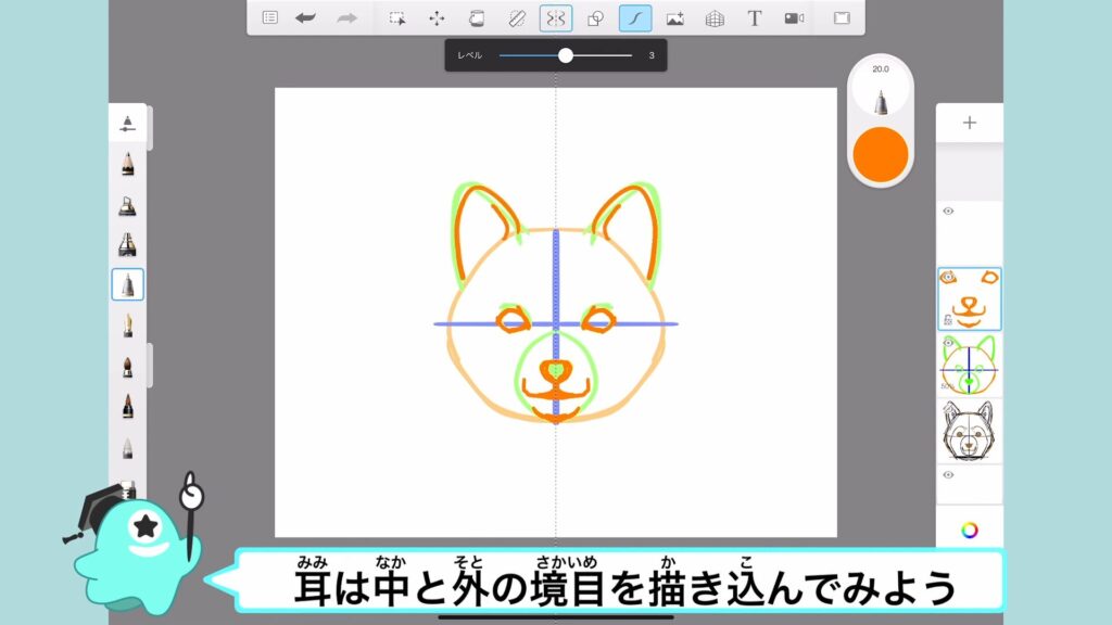 奥側の耳を小さく描いたり、耳の中と外の線を描くと立体的な印象になるよ。