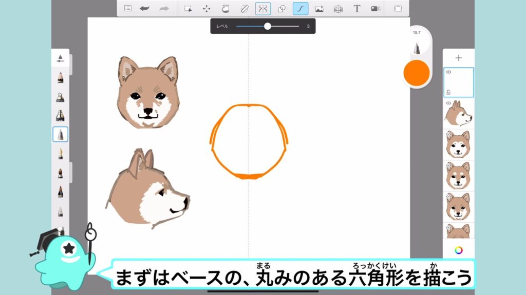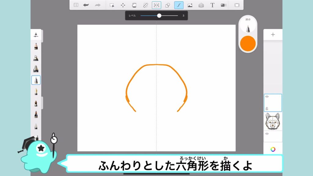 まずはふんわりとした六角形で犬の顔の輪郭を描くよ。