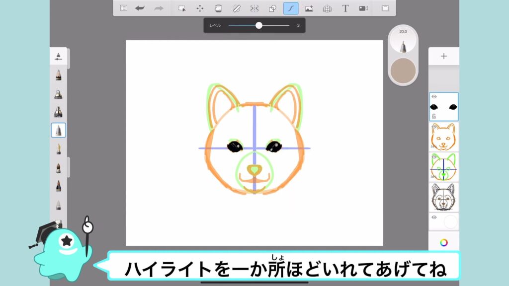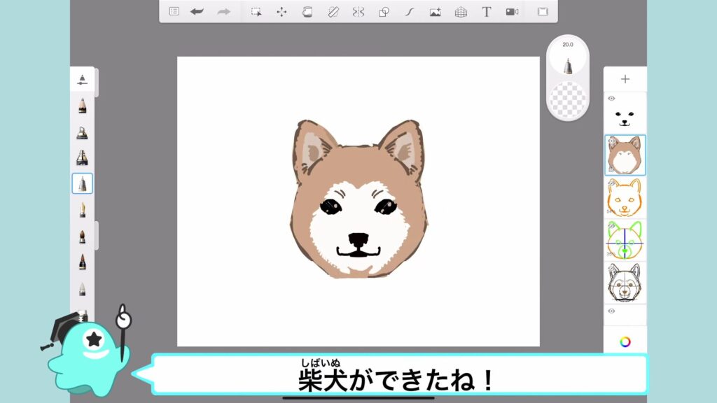 最後に柴犬のほっぺのりんかくも描いて、したがきは完成!